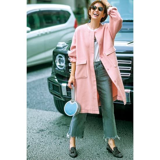 軽やかな素材感なので、ノンストレスに着こなせるのもポイント。高め位置の一つボタンがスタイルUPのアクセントにも。ミドル丈は、デイリーの自転車や車移動の日にも便利です。