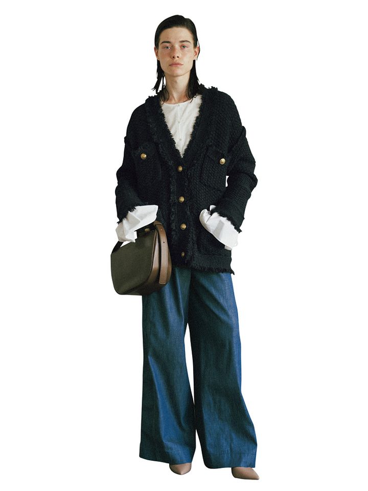 【POINT】デニムと白ブラウスのクラシカルなスタイルに、かっちりとした黒ジャケットだと堅くなりがち。ツイード風のニットで穏やかにまとめて、見た目も着心地もリラックス。