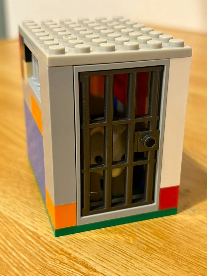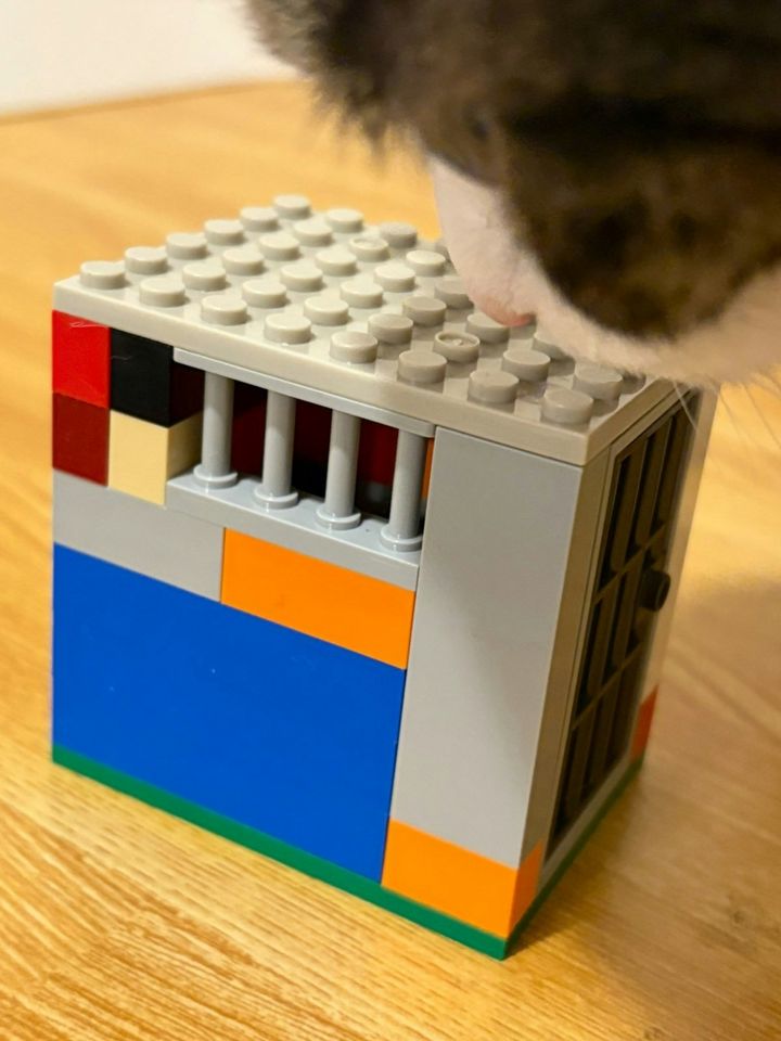 四角い建物、正面にはしっかりした鉄格子風の扉…確かにちょっと独房っぽいかもしれません。中にはシルバニアの人形が佇んでおり、その姿がまた絶妙に哀愁を漂わせています。しかし、なべやきさんがレゴで家を作ろうと考えたのは間違いなく愛。思い描いていたものと違っても、わが子を楽しませようとした気持ちは本物ですよね。愛猫さんが様子を伺っているのもかわいいです。