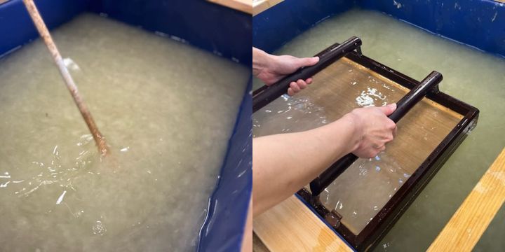 石州半紙は地元の楮(こうぞ)を原料とし、強靭で水に強いのが特徴。伝統的な「流し漉き」によって一枚ずつ丁寧に作られます。「石州半紙」は広義の石州和紙のなかでも最上級品。地元の良質な楮のみを使い、重要無形文化財の伝統的な製法を守って作られる手漉きの半紙を、石州和紙のなかでも特に「石州半紙」と呼ぶのです。