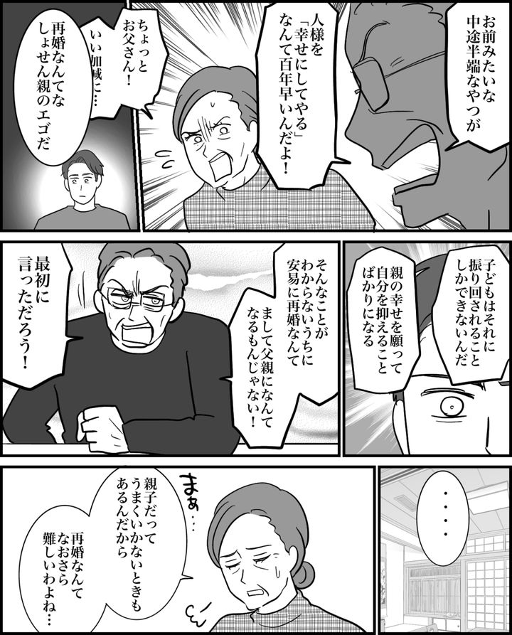 もともと両親は再婚に良い顔をしていなかった。子どもがいる相手は難しいだろうという理由だった。きっと子どもたちの「親」になることを俺が安易に考えていると、両親には見透かされていたのだろう。