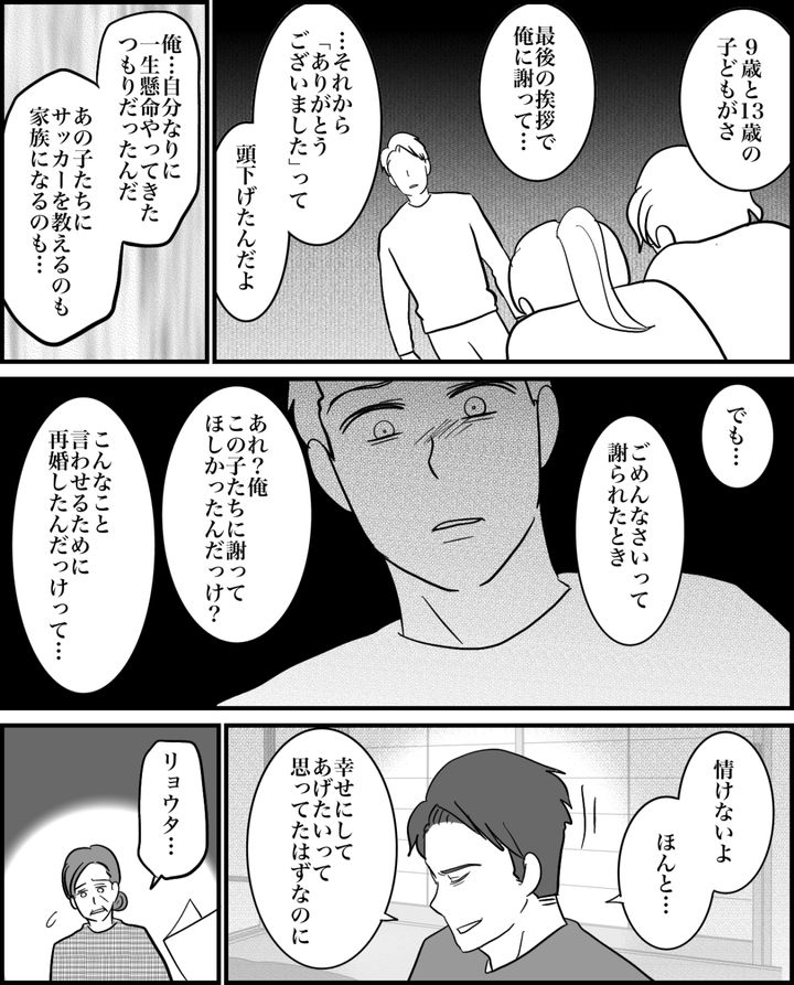 俺(リョウタ)は、3年前にトモコと再婚した。トモコには前夫の子が2人いる。子どもたちがサッカーを頑張る姿を見て「この家族の力になってあげたい」と心から思ったのだ。けれど再婚してみると次第に、俺が求めるものとトモコが求めるものに違いが生じはじめた。最終的に俺たちは離婚することに……。俺は結局、子どもたちと「コーチ」と「教え子」のような関係しか築くことができなかったのだろう。トモコたちが家を出て行った後、俺は実家へ向かった。