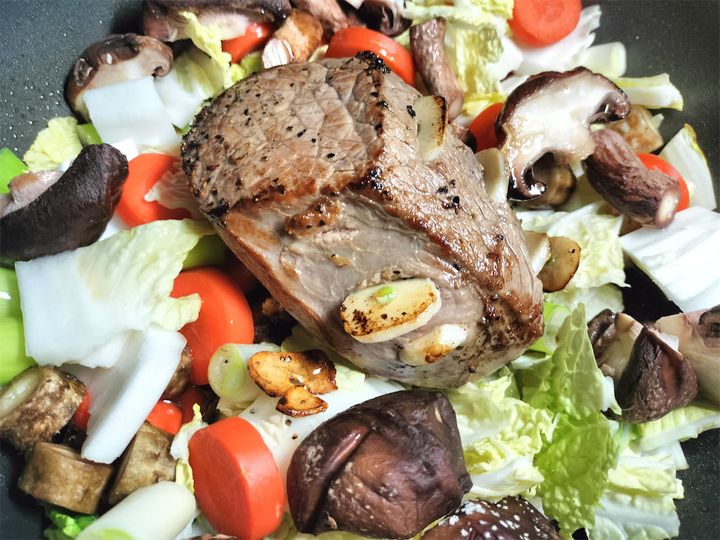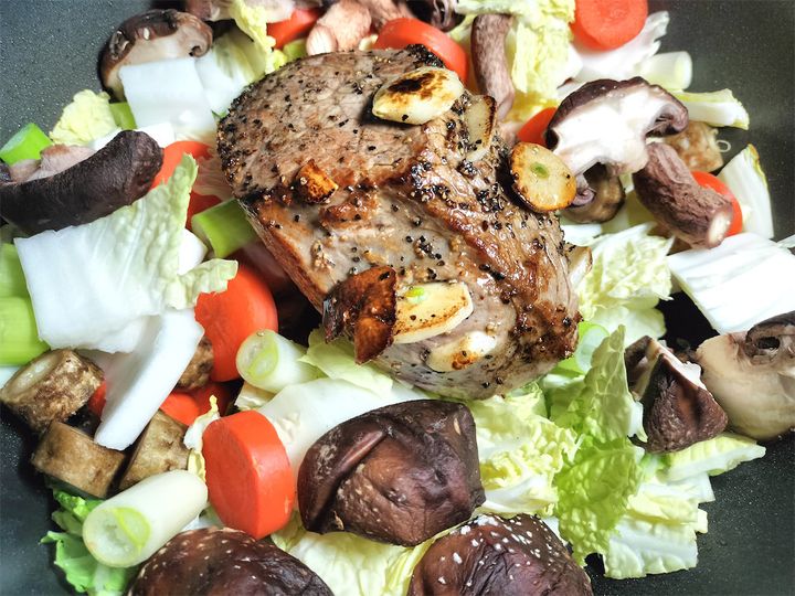 6. 器に野菜を盛り、薄切りにした肉をのせて出来上がりです。