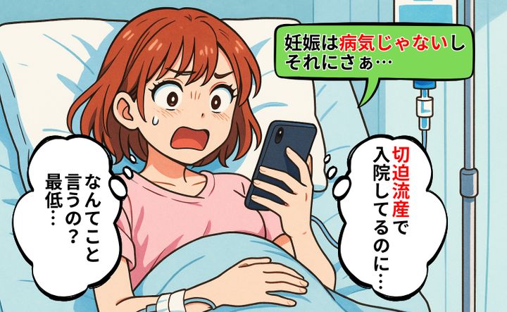 そんな中、友だちから「大丈夫?」と連絡が。私は「つらい」と、そのときの気持ちを正直に伝えました。すると予想もしていなかった返事が。「そうなんだ。でも妊娠は病気じゃないからね。同じ入院でも病気の人のほうがつらいから」と言われ、私の中で何かがプツンと切れてしまいました。