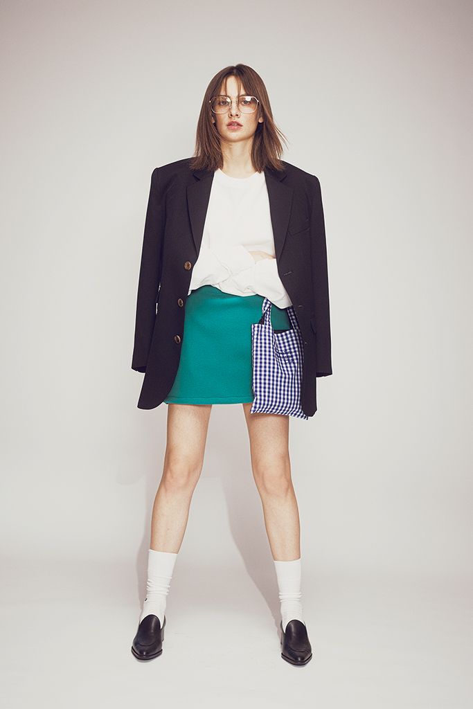 グリーンフリースミニスカート、肩にかけたジャケット、バッグ/以上SEA(エスストア) 白ロングスリーブTシャツ/ATON(ATON AOYAMA) 眼鏡/COACH(ルックスオティカジャパン カスタマーサービス) ソックス/TW ローファー/KATIM
