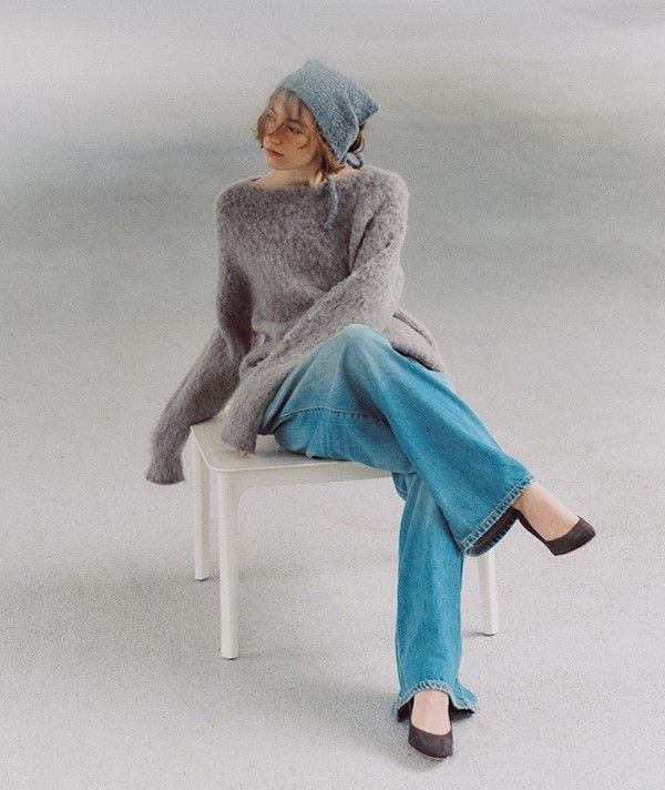 ファーに近い華やかさがあるシャギーニットは、くすんだ色みを選びひかえめな甘さに調整。デニムと合わせた鉄板スタイルを、地味でも派手でもない絶妙な存在感に。バックオープンデザインで、後ろ姿はセンシュアルなムード。あどけなさと大人っぽさを1枚で表現できるから、デニムでくずしてもほどよいあんばいに仕上がる。