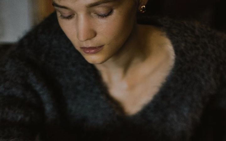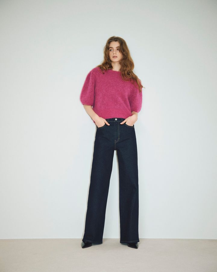 可愛くも高級感のある色。ひじ下から素肌を見せることで抜けが生まれ、甘さが中和される。素材は保温性に優れたアルパカ混。見た目は軽やかでも「しっかり暖かい」という機能性が、真冬のハーフスリーブという選択を後押しする。