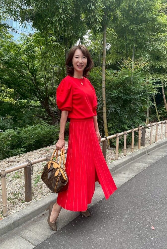 この日は素敵なあの人のイベントに参加していた藤井さん。「ブライトエイジのイベントだったので、“年齢を重ねてもくすまない明るさ”を意識しつつ、“素敵なあの人”世代の明るいエネルギーを表したくてオレンジの『allureville』のセットアップを選びました。肌に血色を与えてくれる上品なトーンが、内側から輝くような美しさを引き出してくれる気がしました。スカートはスリット入りで歩きやすくて、ゆれた時に足がちらっと見える感じがお気に入り。着ていてストレスがないのにキレイ目なフォーマルに見えるところもポイントです」