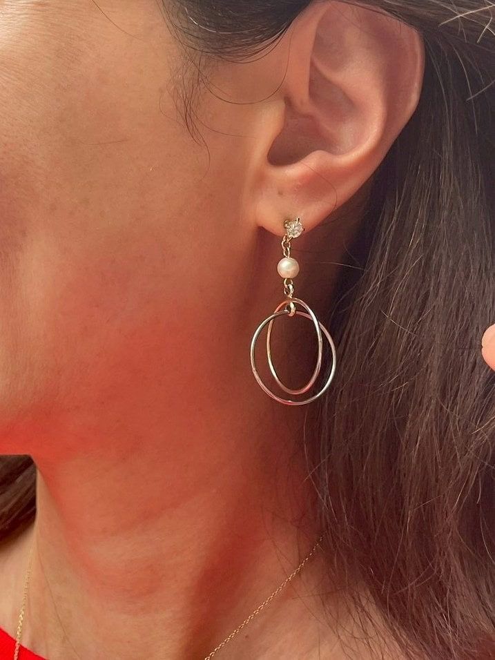 「自分でデザインしたイヤリングは、他のアクセがパールでも石でも合わせられるようにデザインしたものなんです」