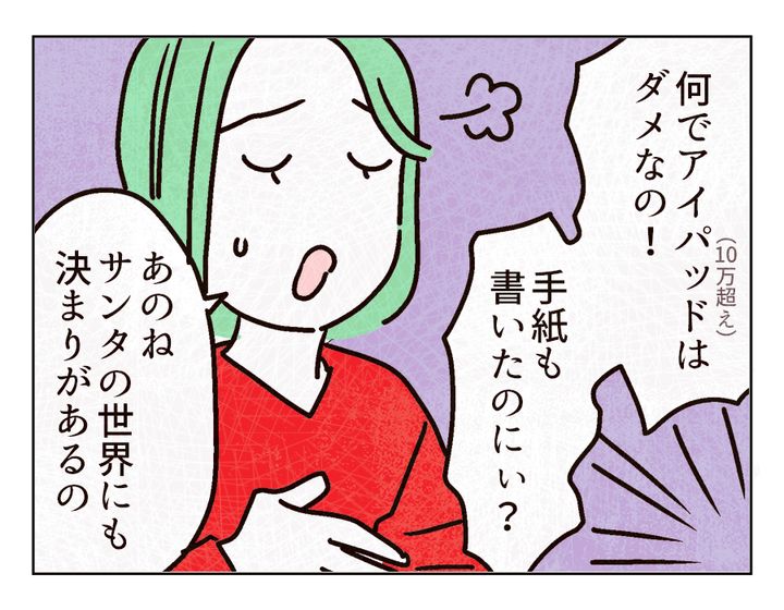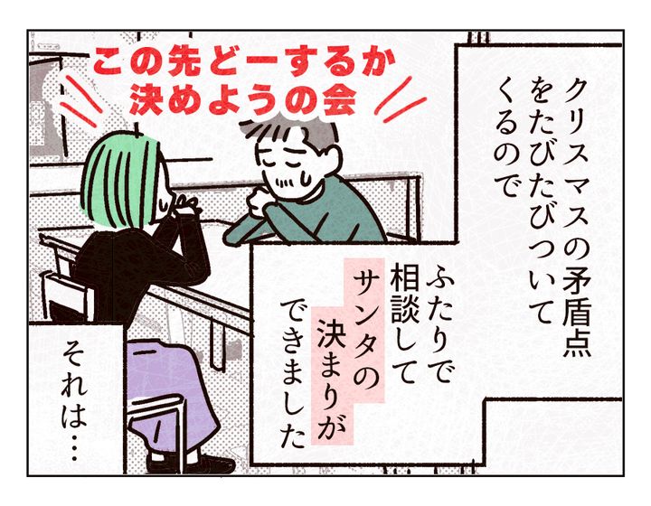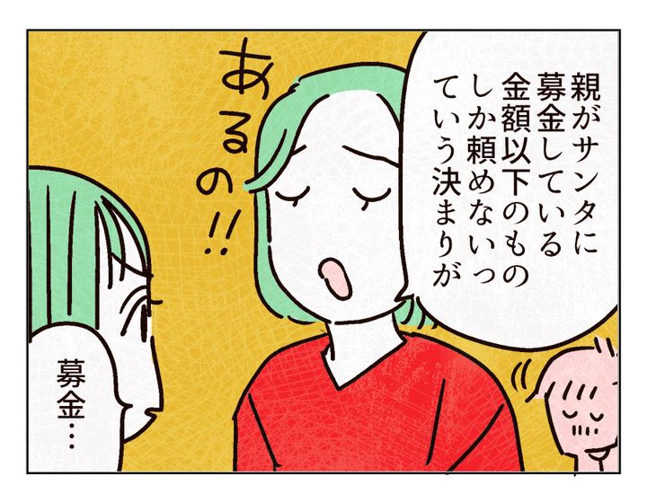 キムラ家のサンタさんは最近ピンチをむかえています。「もうバラしてもいいのでは」というママの案もでたのですが、パパは「もう少しだけ……」と食い下がる形に。話し合いの結果「サンタには募金額以下のものしか頼めない」という決まりができました。システムチックなサンタさんですね……!