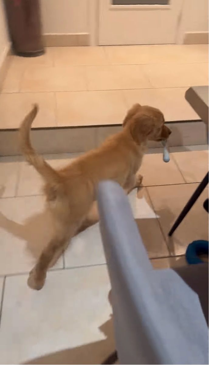 イスに登ることを覚えて、テーブルの上の物を取ることに成功した子犬。 そこで、飼い主さんが取り返そうと追いかけますが、子犬は必死に逃げ回ります!