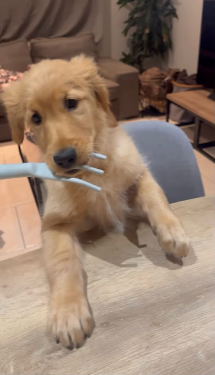 子犬のズコは、テーブルの上から飼い主さんのヘッドマッサージャーを取ることに成功。