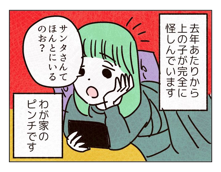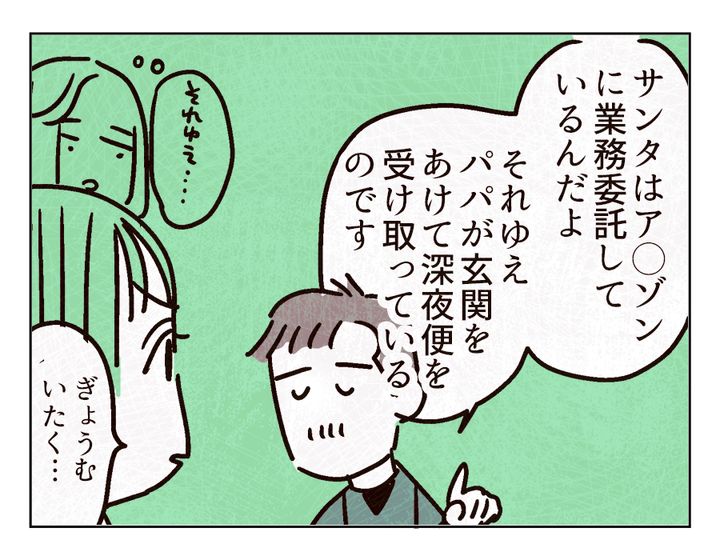 キムラ家のサンタさんは最近ピンチをむかえています。「もうバラしてもいいのでは」というママの案もでたのですが、パパは「もう少しだけ……」と食い下がる形に。話し合いの結果いろいろな「サンタの決まり」ができました。業務委託もその決まりのひとつです。子どもの疑問にサラッと答えられるパパ。「この先どーするか決めようの会」で話し合いをした成果が出ていますね……!