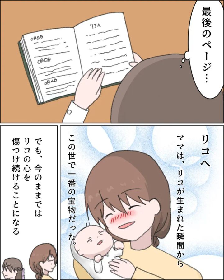 日記の最後のページには、家を出る前のお母さんから私へのメッセージが綴られていました。『リコへ。ママは、リコが生まれた瞬間からリコがこの世で一番の宝物だった。でも、今のままではリコの心を傷つけ続けることになる』