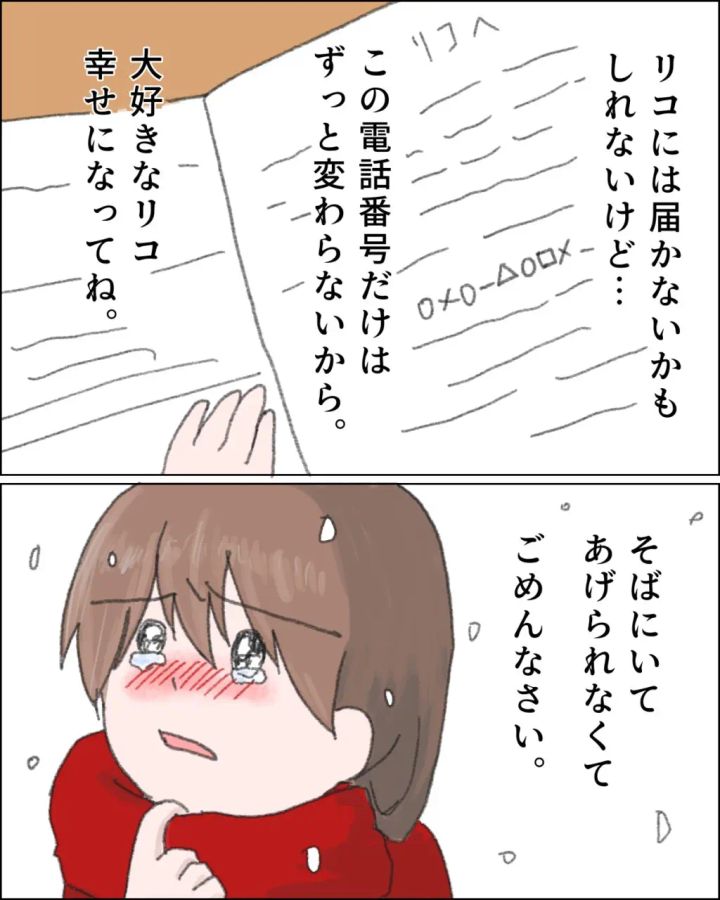 『リコにはとどかないかもしれないけど・・この電話番号だけはずっと変わらないから。大好きなリコ、幸せになってね。そばにいてあげられなくてごめんなさい』お母さんが出て行ったのは私が嫌いだったからではなく、私の幸せを願ってのことでした。私を可愛がってくれていたおばあちゃんが、私がお母さんを嫌いになるように仕向けていたなんて・・。