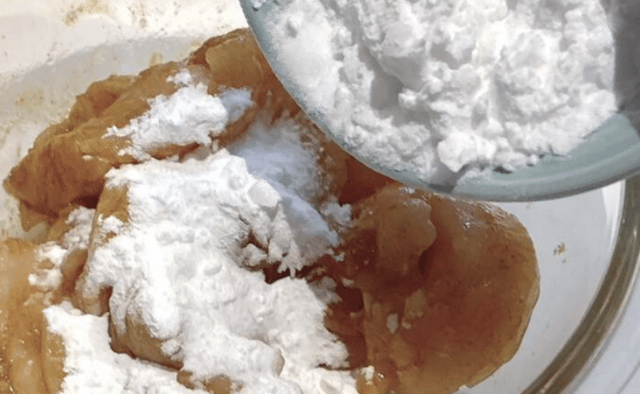 漬け汁を吸ったら、ボウルに片栗粉を投入します。