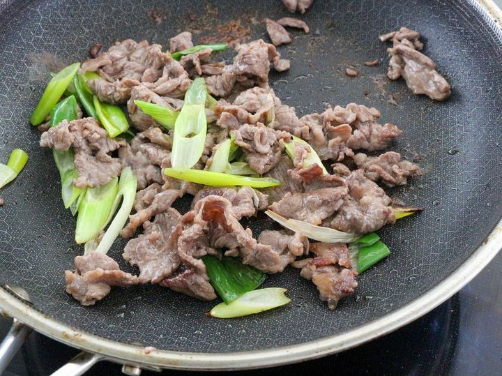 3. 香りがたったら、2に牛肉と長ねぎを加え炒める。
