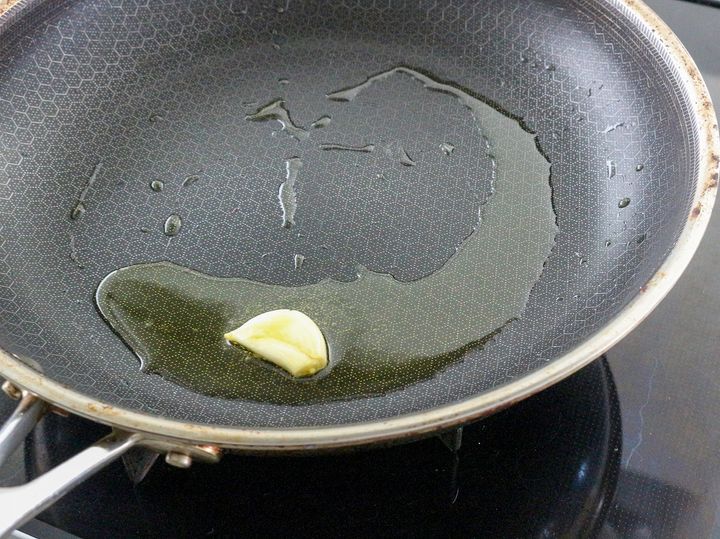 2. オリーブオイルとにんにくを弱火にかけ香りを移す。