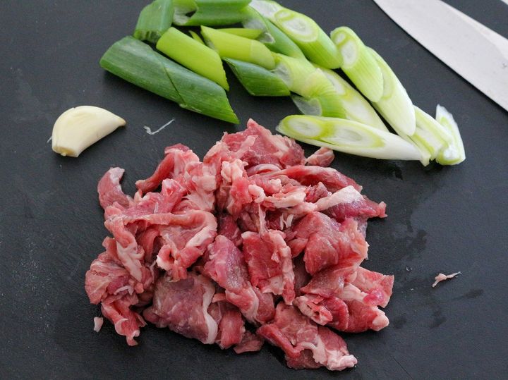 1. 牛肉は食べやすい大きさ、長ねぎはななめ薄切りにし、にんにくは皮をむいてつぶしておく。