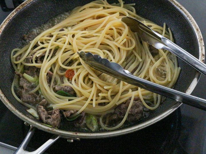 年の瀬は一皿でしっぽり。さっと作れてお酒がすすむ「牛肉とねぎの柚子胡椒パスタ」
