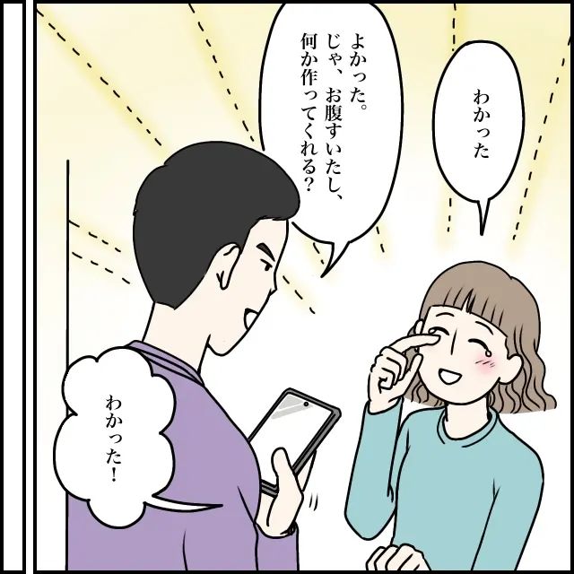 このまま別れるなんて嫌。せめてちゃんと話がしたい。タカシからの連絡を待っている間、私はスマホを片時も手放せませんでした。そして翌日、旅行から帰ってきたのか、タカシから「今から行く」と連絡がありました。私は胸の前でスマホを握りしめ「よかった!」と安堵します。