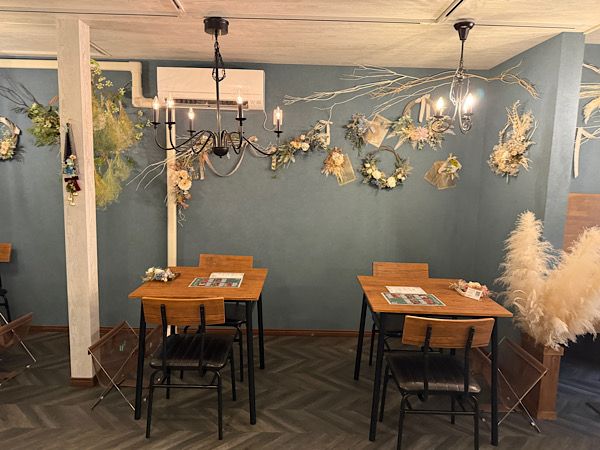 中に入ると落ち着いた壁紙にグリーンがいっぱい飾ってあり、素敵な空間です。