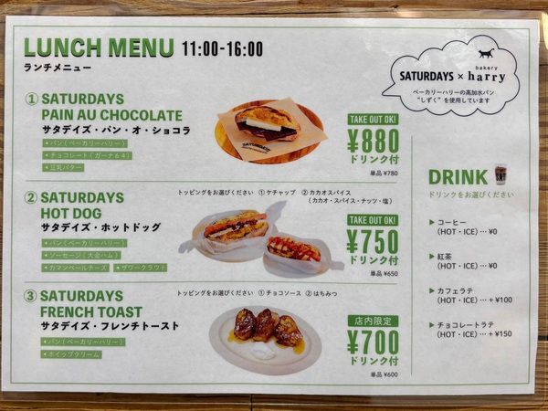 今回のお目当てのランチはホットサンド2種類もしくはフレンチトーストに、選べるドリンクがセットで700円〜880円。フードとドリンク全て通常メニューと同じサイズで、どの組み合わせでも、単品でオーダーするより450円分お得になります。