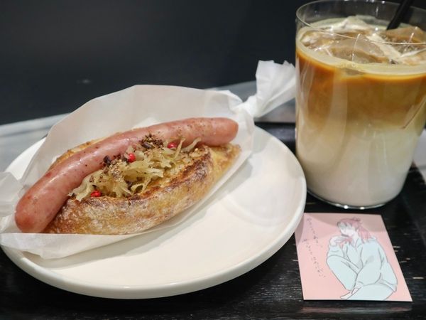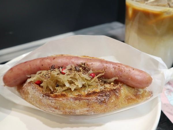香ばしくリベイクされた高加水のパンで、ロングフランク、ザワークラウト(キャベツ)、カマンベールチーズを挟んだおしゃれなビジュアル!