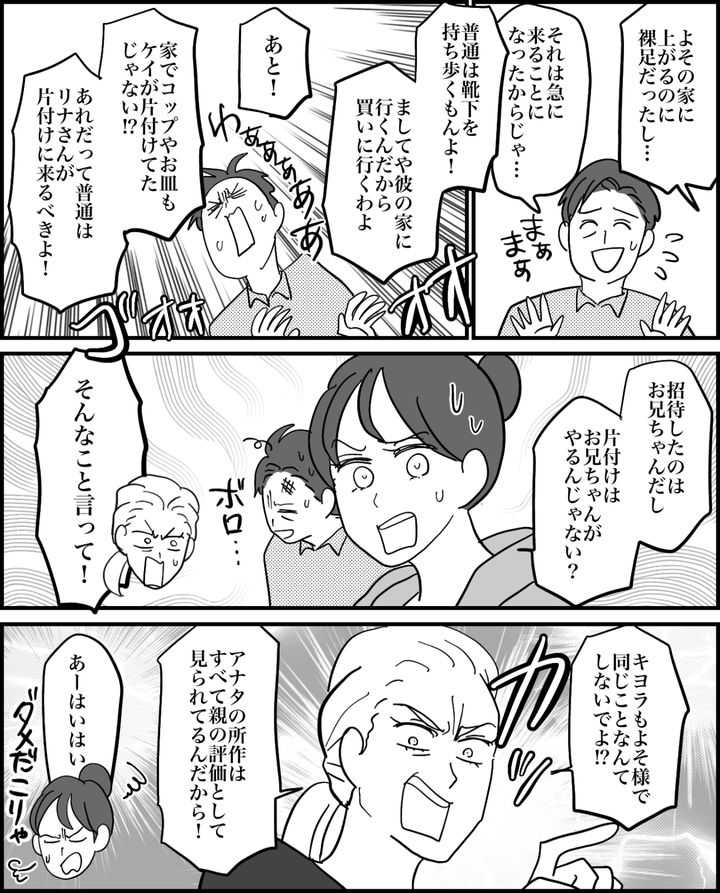 私はヨウコ。息子のケイは大学2年生、娘のキヨラは高校2年生です。ある休日の午後、息子が大学の課題を一緒にすると言って彼女のリナさんを家に連れてきました。夫が誘ってその後みんなで一緒に焼肉店に行ったのですが、箸やお茶碗の持ち方がまるでなっていないリナさん。しかもリアクションがいちいち大げさでうるさいのです。息子の彼女にいろいろ求めるタイプではない私でも、リナさんに対しては「ないな……」と思ってしまったのでした。