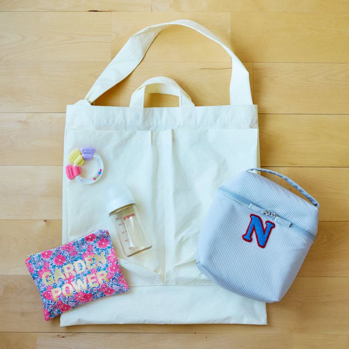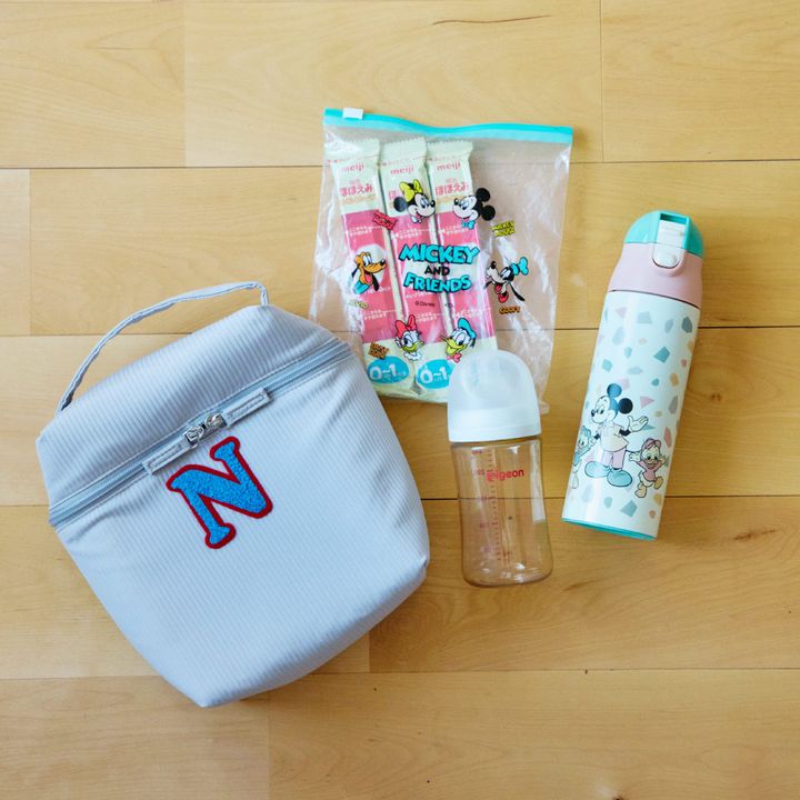「ジッパー付きの袋に入れたキューブタイプのミルク、『ピジョン』の哺乳瓶とお湯を入れた『スケーター』のボトルは、『楽天』で購入したポーチに収納。娘のイニシャルのワッペンをつけてカスタムしました。これからは離乳食も入れる予定です!」