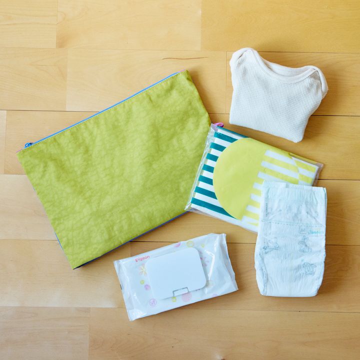「『バグゥ』の大きいサイズのポーチは、マチがあってかなりの収納力!『パンパース』のオムツ、使用済みオムツを入れる収納袋、お尻拭きを入れています。オムツ替えマットは念のために持ち歩いていますが、今のところ出番はないですね(笑)。お着替え用にロンパースも」