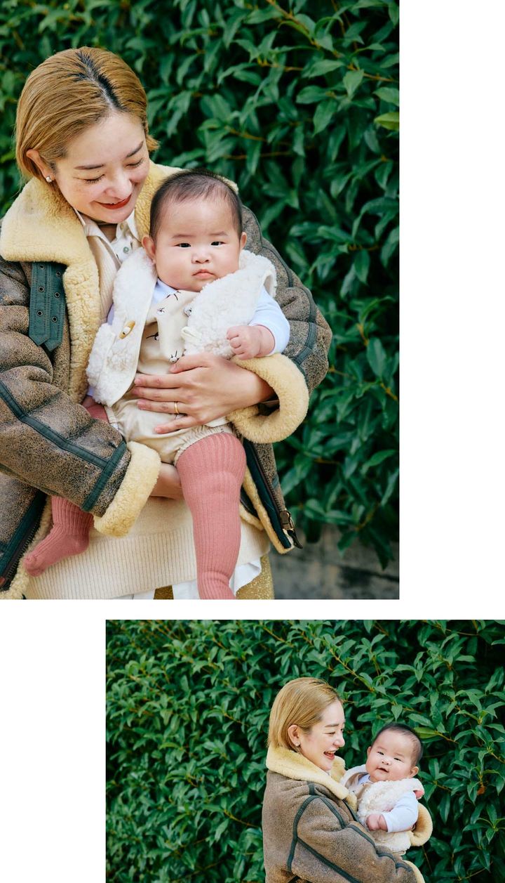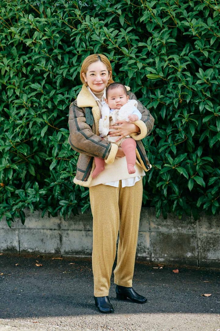 「私は“動きやすく&あったか”をテーマにレイヤード。ニュートラルなベージュコーデは濃淡や素材を変え、立体感が出るようにひと工夫。娘も同系色で全身をコーディネートしつつ、ピンクのタイツを可愛い挿し色に。ボアのベストで防寒対策も抜かりなく!」(mama)ヴィンテージのジャケット、シーナリーのタートルトップス・シャツ・ニット、ヴィンテージのパンツ、メゾン マルジェラのブーツ