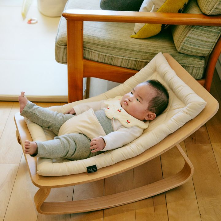 「オンラインで購入した『チャーリークレーン』のバウンサーは、場所を取らないミニマルなデザインとインテリアに馴染むカラーがお気に入り。子どもの成長に合わせてロッキングチェアにも変えられるので、長く愛用できます」