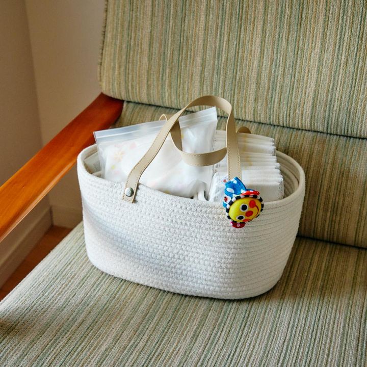 「オムツストッカーは『楽天』で購入。オムツ、保湿剤、爪切り、くし、綿棒、お尻拭きなど、お世話グッズがまるっと収納できます。見た目もシンプルでおしゃれ! 実家に帰省するときはこのストッカーごと持っていきます♪」