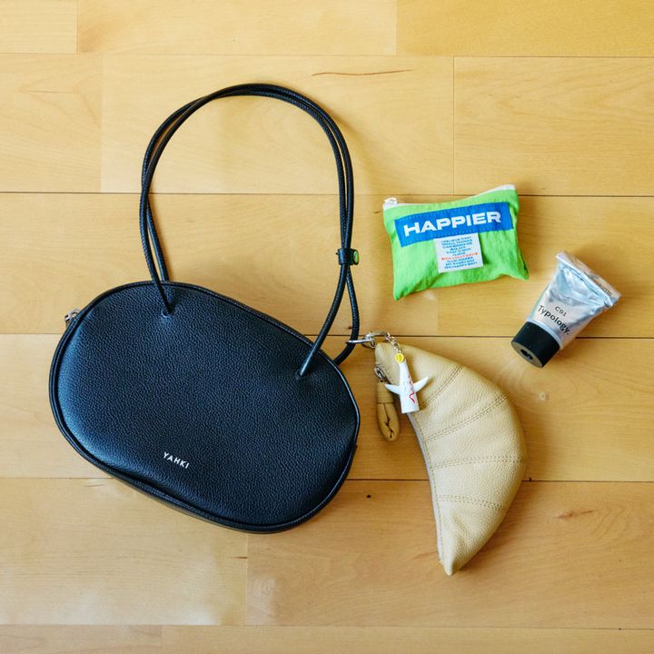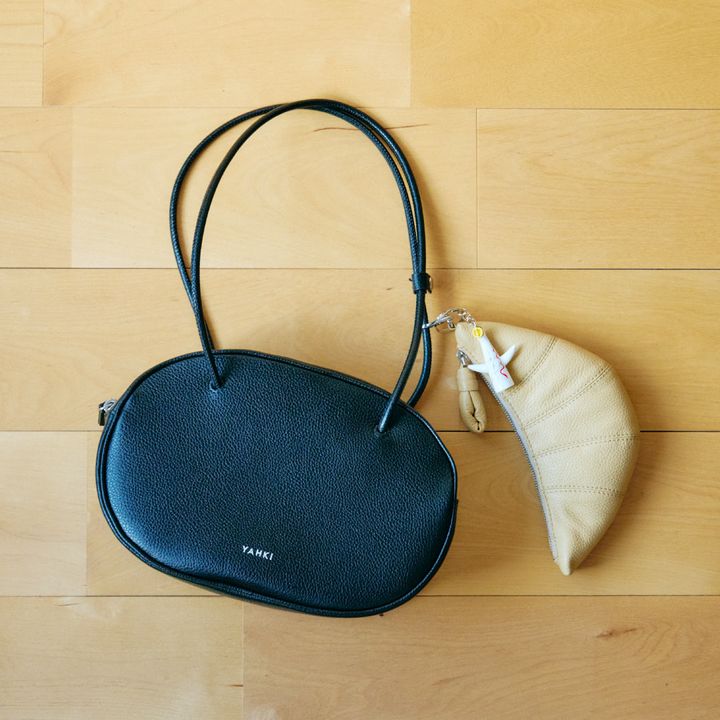 「丸みのあるフォルムが可愛い『ヤーキ』のバッグは、ミニマルなサイズながら収納力抜群。関西旅行の際に自分へのお土産として購入した『太陽の塔』のキーホルダーと、『ルメール』のクロワッサン型ポーチをつけてカスタム。このポーチは鍵やリップも収納できて◎」