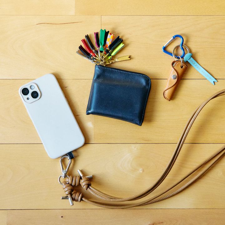 「スマホには『イッチ』のロングストラップを。子どもと一緒だと、スマホをバッグから探す余裕も時間もないので、首や肩にかけています。『コムデギャルソン』のお財布には必要なものだけを。鍵のチャームは海外のお土産とハートのカラビナをつけて爽やかに」