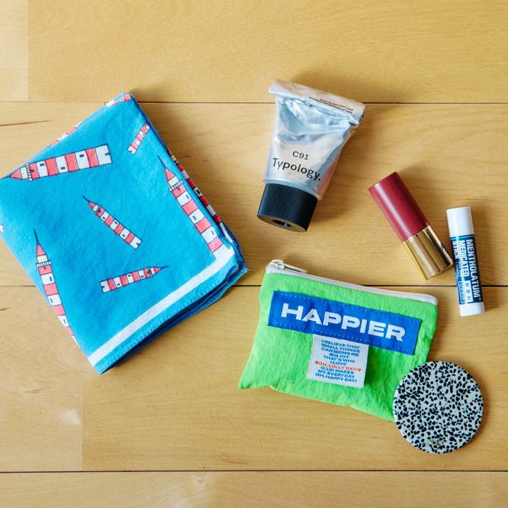 「メイクポーチは韓国の雑貨屋『HAPPIER MART』のもの。古着屋で購入したハンカチ、『シーナリー』のノベルティの鏡、『メンソレータム』の薬用リップ、『リーカ』のリップなど必要最低限のものだけをイン。『ティポロジー』のクリームは親子でシェアできるのでこの1本さえあれば」