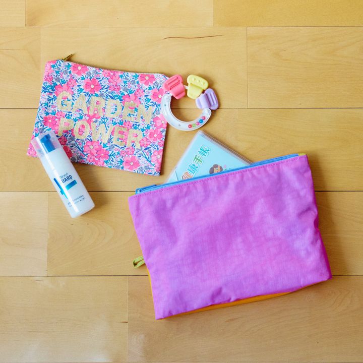 「『ボントン』の花柄ポーチはフランス出張の際に自分用に購入したもの。そこに『ビオレガード』の消毒液と『ピジョン』の歯固めを入れています。消毒液はミルクをつくったりオムツ交換の際など、何かと使えるので必ず携帯。『バグゥ』のミニポーチには、母子手帳や病院の診察券などをイン」