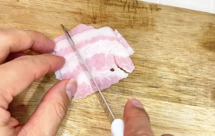 ベーコンは食べやすい大きさにカットし、耐熱皿に広げてラップをふんわりかけたら、500Wの電子レンジで30〜50秒ほど温めます。