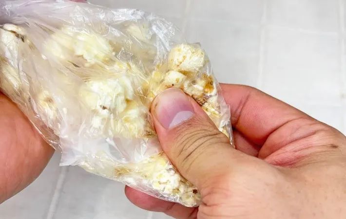 次に、ポップコーンの下準備をします。ポリ袋にポップコーンを入れ、麺棒や手で軽く砕き、3〜5mm程度の粗めのフレーク状にしましょう。