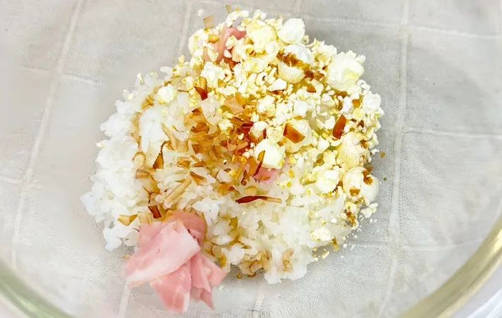 ボウルに温かいご飯を入れ、先ほどのベーコンと砕いたポップコーン、かつお節、醤油を加えてさっくりと混ぜ合わせましょう。