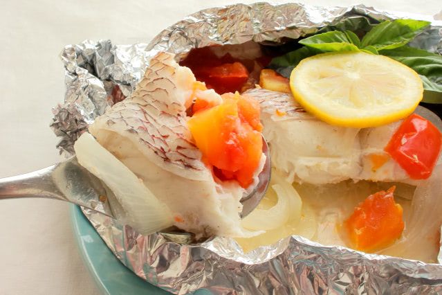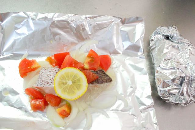 3. 正方形に切ったアルミホイルに2の玉ねぎ、1の鯛、2のトマトの順に重ね、塩、こしょう、白ワイン(または酒)を振ってレモンをのせ、口をしっかりと閉じるように包みます。