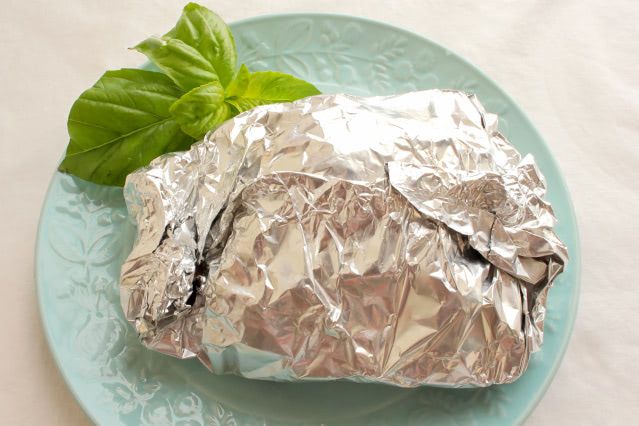 ホイル包みをお皿にのせ、アルミホイルの口を開いてバジルの葉をのせたら完成です。