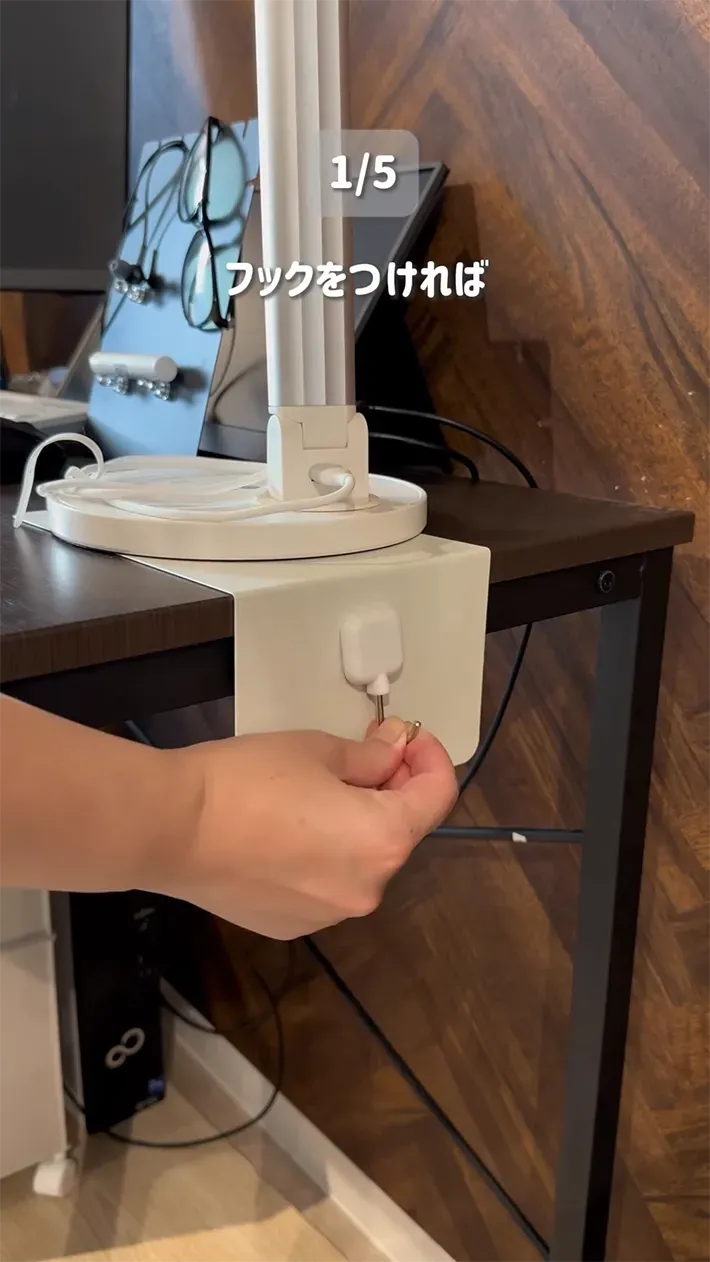 机の端に置いたブックエンドの上に、電気スタンドといった重みのあるものをのせ、100円ショップでも購入できるマグネット式フックを取りつけてください。