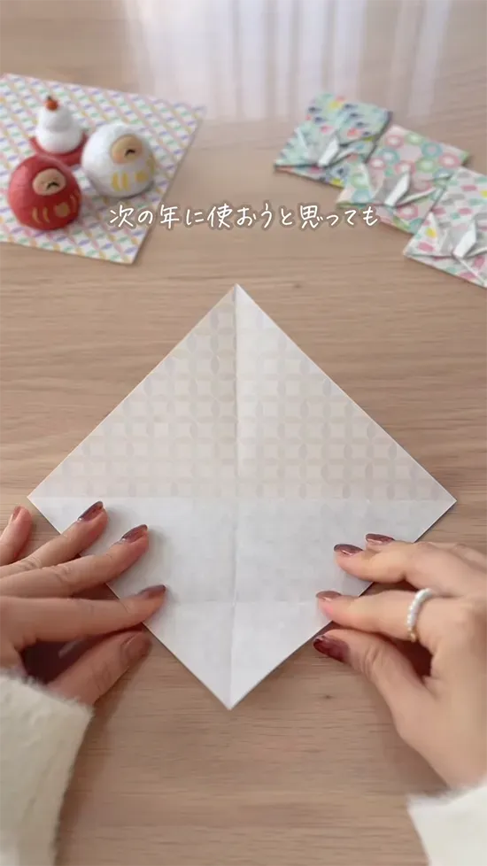 そららさんは、100円ショップ『セリア』で購入した折り紙1枚で、『折り鶴ポチ袋』の作り方を紹介しました。早速手順を見ていきましょう。