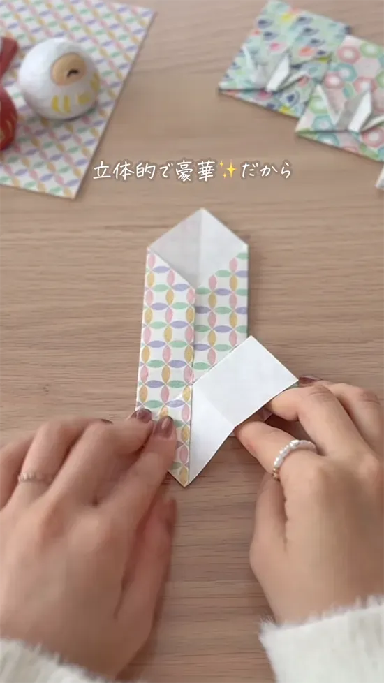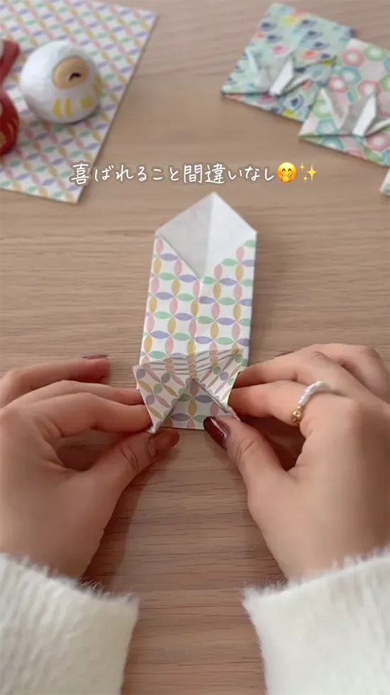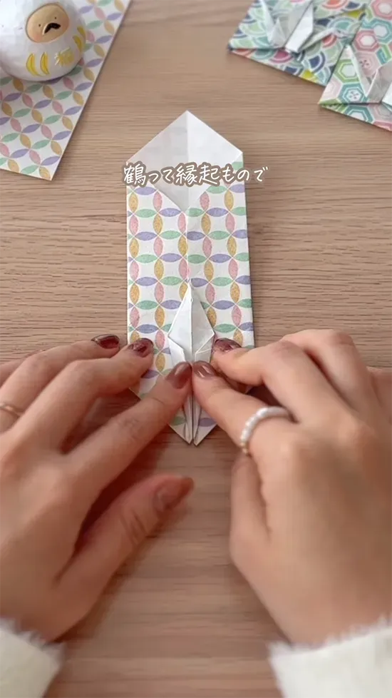 尻尾と頭を作り、上の角を鶴の下に折り込めば、手作りポチ袋の完成です!