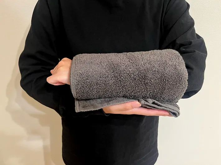 保冷剤などをタオルで包み、腕に当てながら巻いていきます。