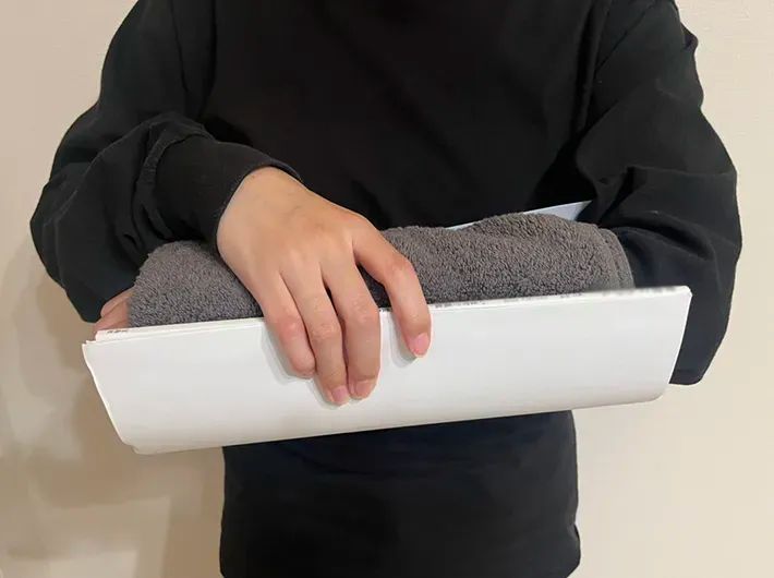 次に、雑誌や新聞紙を腕の下から支えるように包んでください。