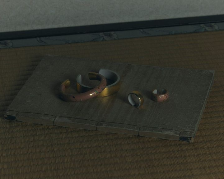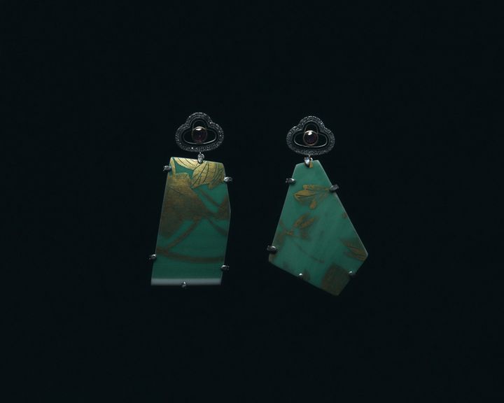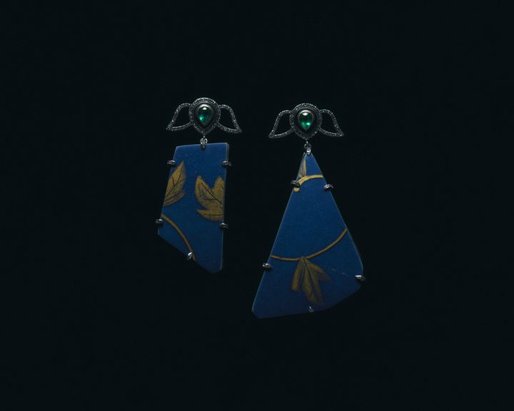 錦⼭窯との創作の始まりは、「シャランポワ」のデザイナーである安部真理子氏が、2024年元⽇の能登半島地震によって破損した多くの貴重な作品と出合ったことにある。彼女は「⾦彩が放つ幽⽞なきらめきに魅せられ、その⽋⽚をひとつの宝⽯として再解釈した」と言う。