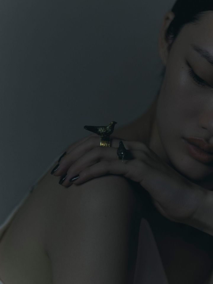 そして、同じく安部真理⼦氏が⼿がけるジュエリーブランドの「アドリン ヒュー」からも九谷焼の破片を宝石としてアップサイクルしたリングコレクションが登場。シグネチャー的なメレダイヤモンドを添えた"Canan Ring"や、ブラックとホワイトのエナメルで縁取った"Mibu Ring"などを展開。